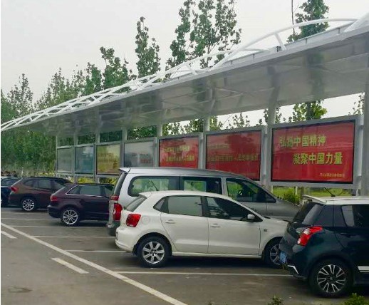遮阳车棚广告由石家庄宇东广告有限公司投资建设,采用轻钢遮阳棚加立面广告位的结构形式,按照统一设计、彰显特色、合理规划的思路进行设置,使遮阳车棚与车辆以及服务区自然环境贴切地融为一体,创新了广告载体,即做到了美化、亮化,又能为司乘人员遮风避雨,同时可实现广告创收近百万元。