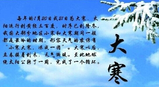 大寒节气,大气环流比较稳定,环流调整周期大约为20天左右。此种环流调整时,常出现大范围雨雪天气和大风降温。当东经80度以西为长波脊,东亚为沿海大槽,我国受西北风气流控制及不断补充的冷空气影响便会出现持续低温。同小寒一样,大寒也是表示天气寒冷程度的节气。近代气象观测记录虽然表明,在我国部分地区,大寒不如小寒冷,但是,在某些年份和沿海少数地方,全年最低气温仍然会出现在大寒节气内。所以,应继续做好农作物防寒,特别应注意保护牲畜安全过冬。大寒时节,中国南方大部分地区平均气温多为6℃至8℃,比小寒高出近1℃。“小寒大寒,冷成一团”的谚语,说明大寒节气也是一年中的寒冷时期。